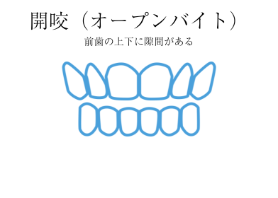 前歯が上下に開いてしまっている噛み合わせを開咬といいます。発音しにくい、麺類が噛み切れない、奥歯に負担がかかりやすいといった問題があります。