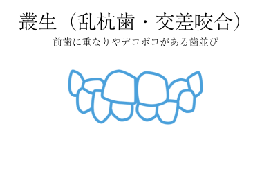 前歯に重なりやデコボコがある歯並びです。歯磨きがしにくく虫歯になりやすい歯並びでもあります。